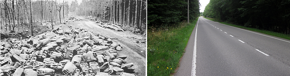 Today this intersection is no longer recognizable as such. An industry terrain next to the motorway, has swallowed the forest and the intersection. Now days this intersection has become a roundabout. The only thing left are the signs with the correct distances which indicate the routes the Kampfgruppe took.